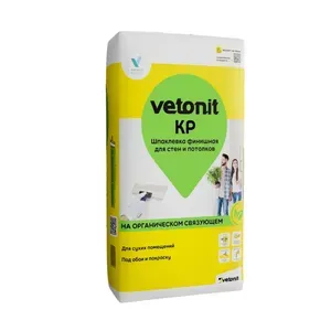 Vetonit КР - белая сухая финишная шпаклевка на органическом связующем. Предназначена для финишного выравнивания стен и потолков в сухих помещениях перед оклейкой обоями и покраской. Имея максимальный размер зерна всего 0,3 мм, она позволяет создать гладкий матовый защитный слой. Применяется для внутренних работ.