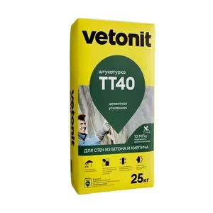 Vetonit TT40 - универсальная цементная штукатурка. Подходит для оштукатуривания фасадов, для предварительного выравнивания и ремонта стен и потолков в сухих, влажных и мокрых помещениях перед дальнейшим шпаклеванием, перед облицовкой керамической плиткой. Применяется по основаниям из бетона, кирпича, керамзитобетонных блоков, цементных штукатурок. Обладает повышенной влагостойкостью, высокой прочностью, трещиностойкостью, морозостойкостью. Для внутренних и наружных работ. Наносится ручным и машинным способом.
